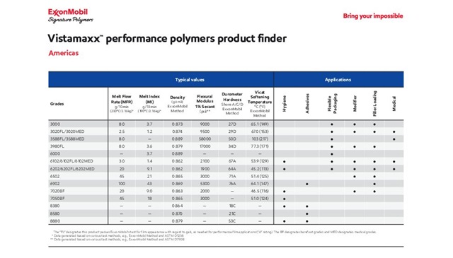 Explore our wide portfolio of Vistamaxx performance polymers grades applied in various industries for Americas region.